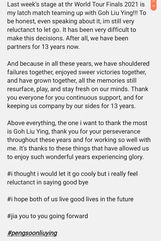Shu Rest On Twitter Chan Peng Soon And Goh Liu Ying Retirement Statement Thank You Malaysia S Pride Teammalaysia Pengsoonliuying Bwfworldtourfinals2021 Https T Co Kmvstbn7jj Twitter