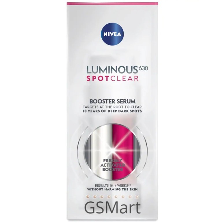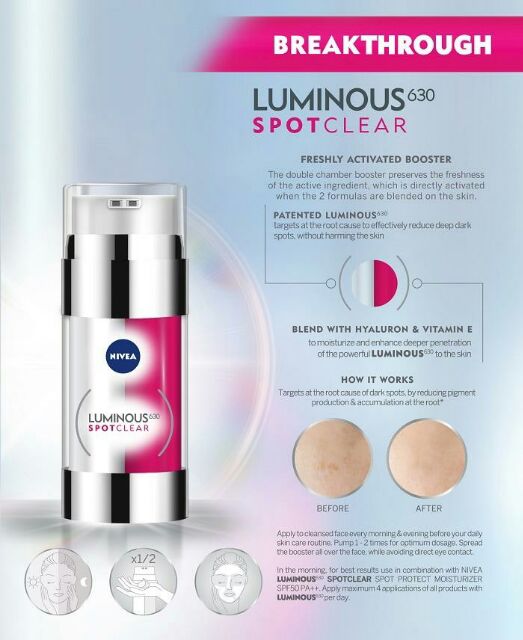 NIVEA Luminous630TM Spotclear Booster Serum 30ml - Targets at the root to clear 10 years of deep dark spots by reducing pigment production accumulation at the root. Based on this they tested more than 50000 possible active ingredients in different optimization rounds and the molecule number 630 was the most successful one in balancing. All three can trigger a melanin imbalance leading to the same result.